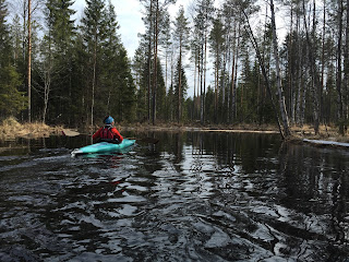 Lunta oli joen reunamilla paikoittain runsaastikin ja joki oli kovertanut jääreunukset ontoiksi. Kevään jäljiltä oli kaikanlaista risua ja muuta karahkaa. Kaksi kajakkia saa näköjään helposti aikaan ruuhkan.