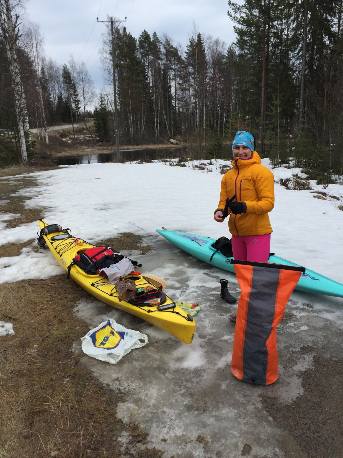 Kamppeet jätettiin odottelemaan rantautumispaikalle, vedettiin vähän lämmikettä niskaan ja lähdettiin taapertamaan kohti autoa. Miun kajakki on niin ahdas, että sinne on turha haaveilla mitään vaihtokampetta, joten romppeet kulkevat Pekan matkassa. Se on tietysti hyvin reilua.